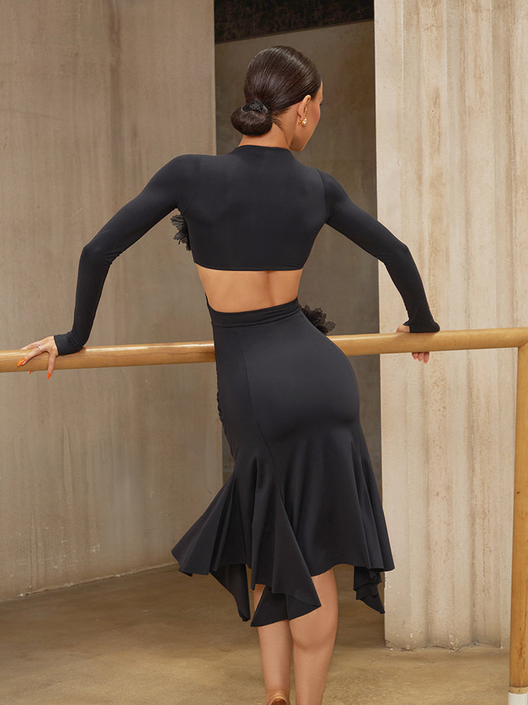 ZYM Fleur Dress 25045 in Classic Black | Latin Dress with Long Sleeves & Waist Cutouts, Front Ruching, Built-in Briefs & Cups for Latin & Salsa Dance Practice, Performance, Social Events & DanceSport Competitions