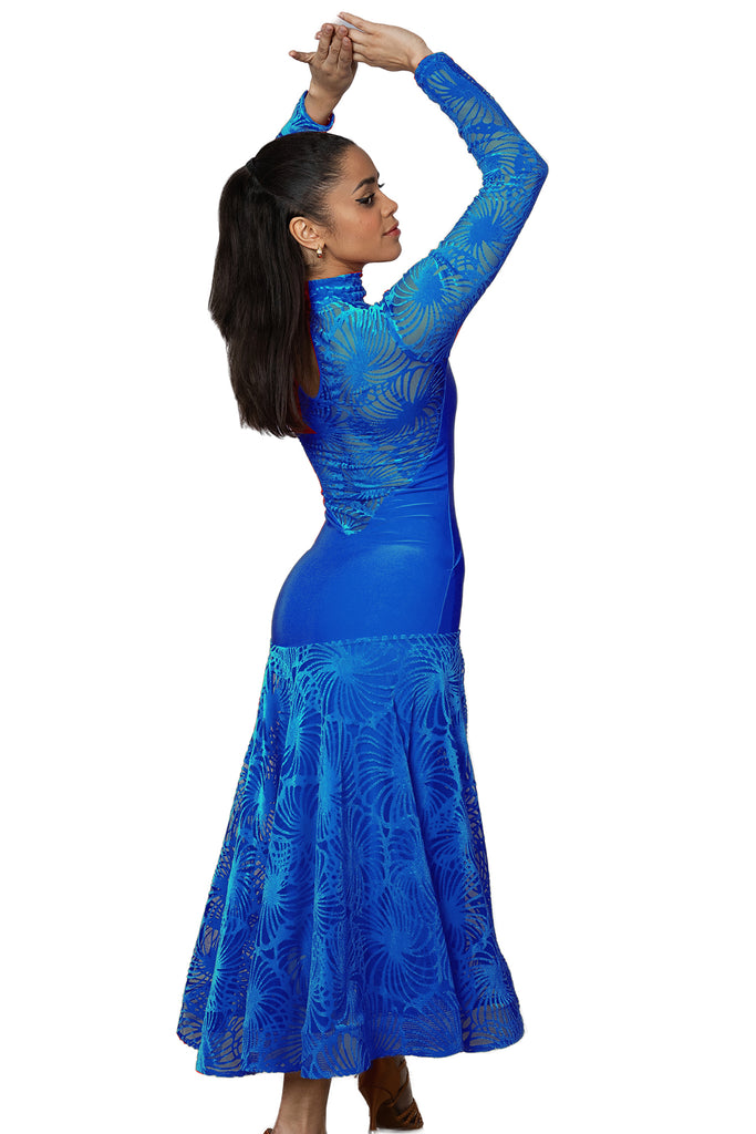 Best Seller! Indulge in luxury with our D2411 Long Velvet Burnout Gown. A full circle velvet burnout skirt with a subtle shine and crinoline provides a stunning silhouette. The back features burnout velvet for a hidden, yet sexy, touch. Experience the ultimate elegance with this dress. Perfect for social dancing & parties, medal exams, performance & competitions.