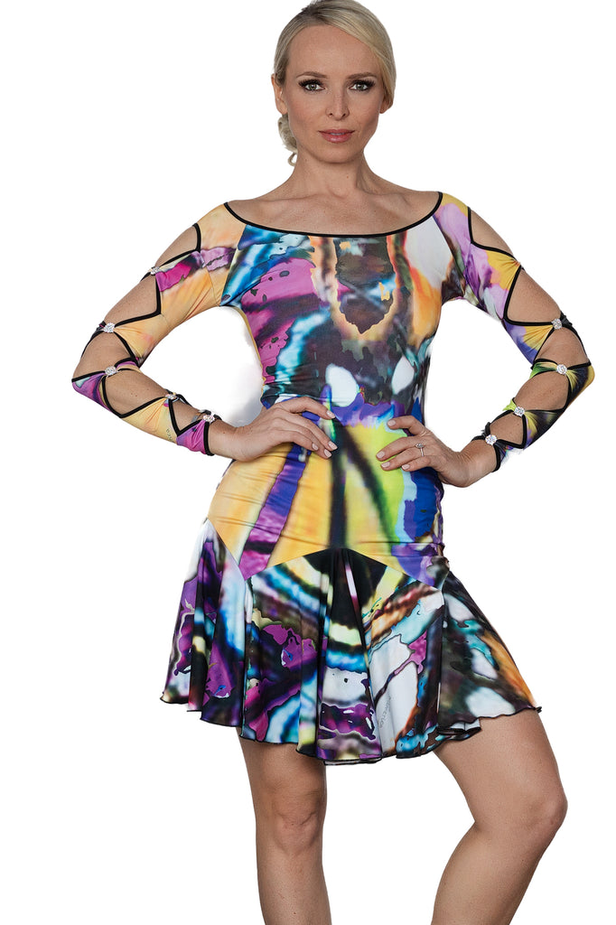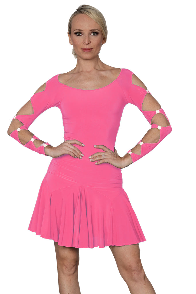 Short Lattice Dress D2403 in Various Colours: Fitted Top, Boat Neckline, Long Sleeves with Feature Rhinestones & Lattice Design on Sleeves & Back, Full Short Skirt for Evening Wear, Social Dancing, Performance & DanceSport Competitions