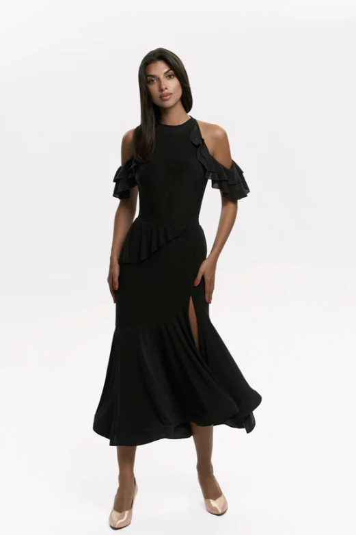 Bodysuit "Polly" by Danza in Black - Dance Bodysuit Feature Frill Sleeves, Cut-Out Shoulders, Open Back, Removable Cups for Dance Practice, Ballroom Dance Medal Exams, DanceSport Competition, Shows or Evening Wear