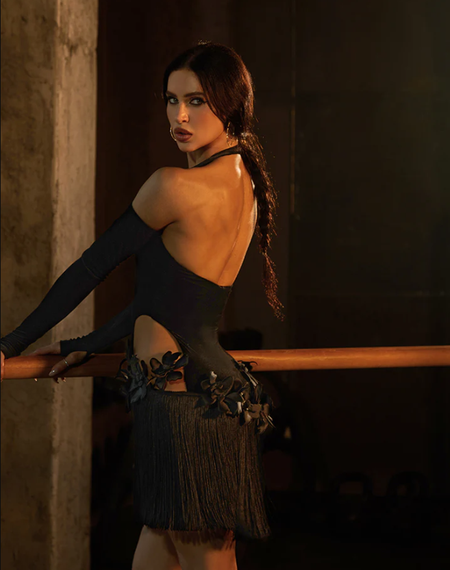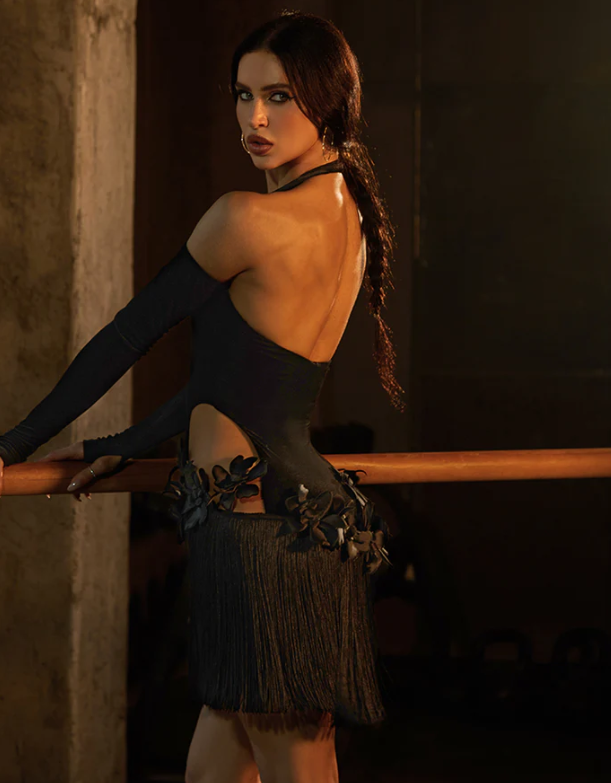 Raven Dress: Her feathers command every beat. With refined cutouts and hand-sewn 3D flowers at both waists, it’s elegant yet confident. The velvet fabric brings a rich, vintage touch, while the fringed hem sways gracefully with every move. Designed to shine on stage, it’s bold, distinctive, and full of character. Eye catching dress for Latin, Salsa & Samba Dance performance & competitions.